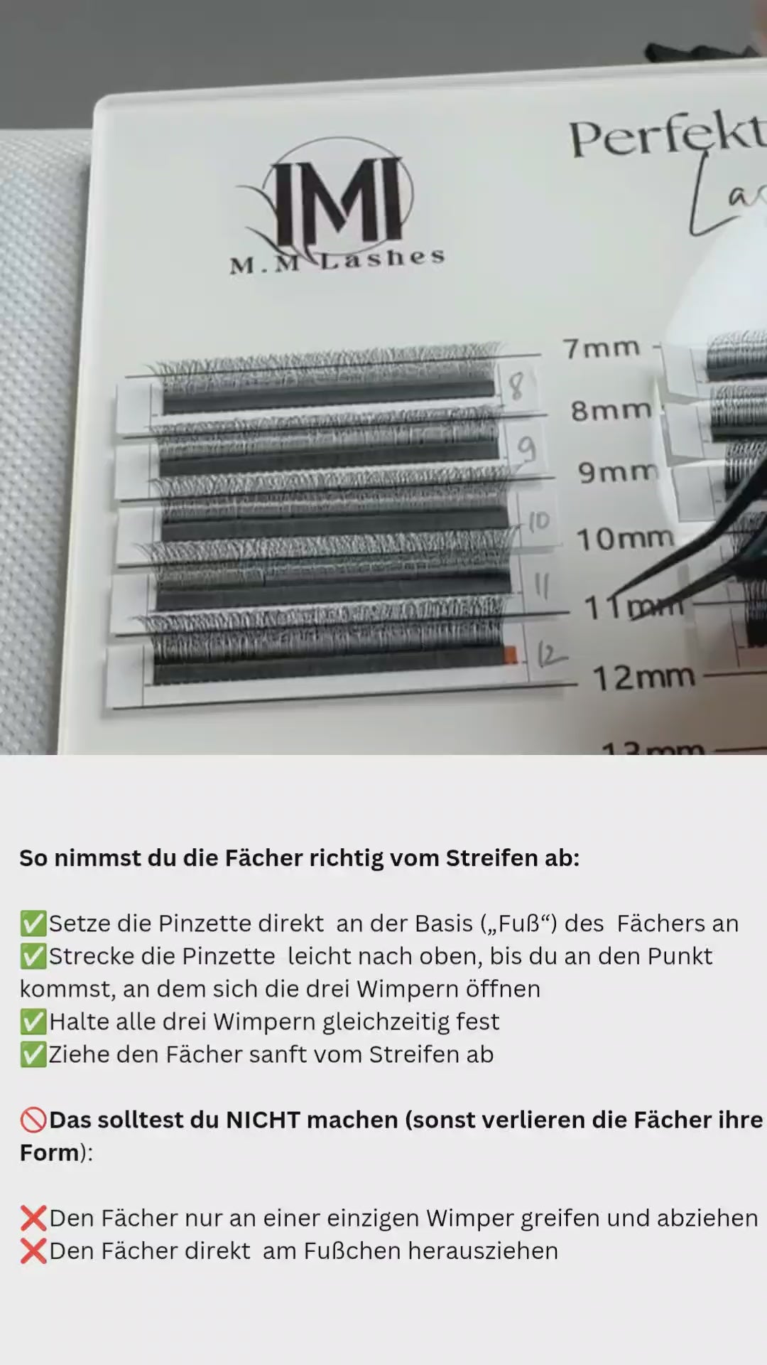 👉 Tipp: Die Wimpernfächer müssen immer von oben aufgenommen werden, dabei alle Wimpern gleichzeitig festhalten und den Fächer sanft vom Strip abziehen.