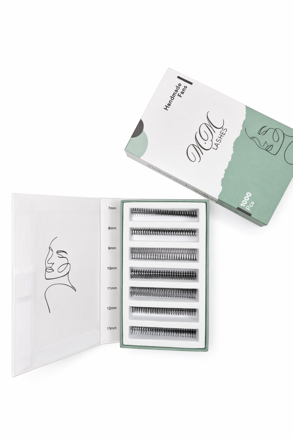 Die fertigen 2D Wimpernfächer befinden sich auf praktischen Klebestreifen und enthalten insgesamt 1.000 fertige Wimpernfächer in verschiedenen Längen von 7 mm bis 13 mm . Erhältlich in den Curls CC und D , bieten sie die perfekte Balance zwischen einem natürlichen und voluminösen Look.